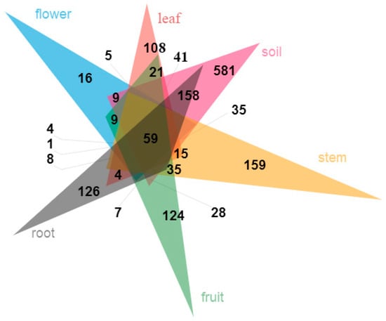 Venn diagram showing shared and unique fungal OTUs in each organ (flower, leaf, fruit, stem, root) and soil.