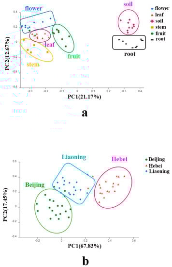 Principal coordinates analysis (PCoA) based on the relative abundance of fungal OTUs showing the fungal community structure: (a) in different organs and soil of Jingbai pear trees; (b) in different sites.