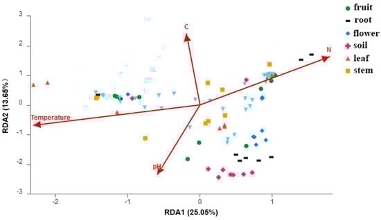 Fungal community structures were significantly correlated with soil properties—soil temperature, pH, N and C, indicating soil may have an influence on the fungal community structure associated with Jingbai pear trees. Plants and soils have a very close mutual relationship. A plant can affect soil organic matter, soil nutrient availability and the composition of soil microbial communities. The influences on soil properties result in net positive or negative feedback effects, which influence plant and community composition [], for example, soil type and properties may alter root development and root exudation []. Endophytic communities live and coevolve with trees for a long time, therefore the structure can be correlated with soil properties [,]. In a recent study, the endophytic bacterial communities associated with Jingbai pear trees also differed significantly among different organs and soils, and the bacterial community structure related significantly to soil properties []. These findings are consistent with the results of this study.
