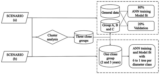 The methods were applied and evaluated in two scenarios: (a) the regression model fit and ANN training with 80% of the data (533 trees), and per clone group, after cluster analysis, with 80% of the trees in each group; and (b) model fit and ANN training with trees of only one clone group at the ages of 2 and 3 years, with six, five, four, three, two, and one tree per diameter class as sample intensities (Figure 3).