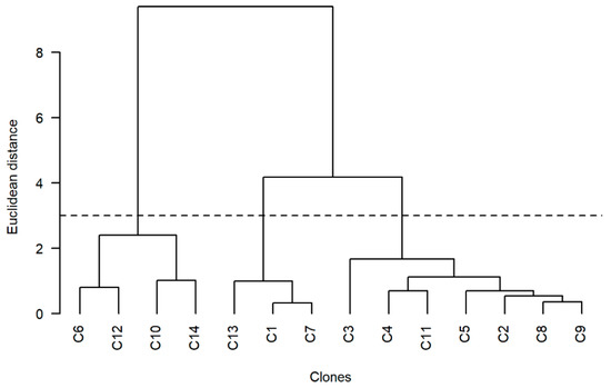 Dendrogram of the cluster analysis using Ward’s method and the Euclidean distance with interception of the branches by the horizontal dashed line for the formation of clusters with Eucalyptus clones: group A: C3, C4, C11, C5, C2, C8, and C9; group B: C13, C1, and C7; and group C: C6, C12, C10, and C14.