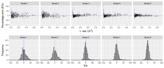 Percentage error vs. real commercial volume with bark up to 4 cm in diameter at the tree top (v) and frequency histogram of E% of the fitted models.