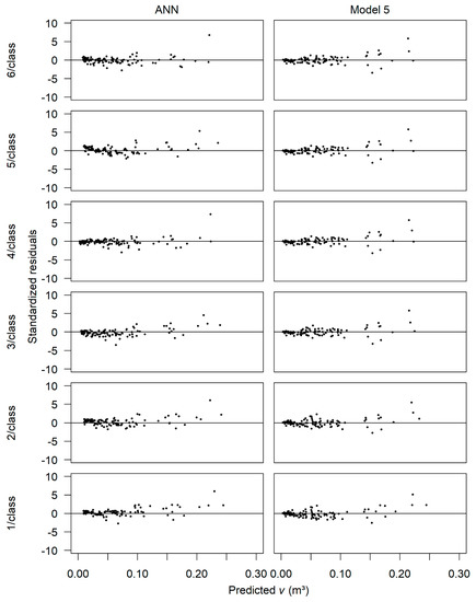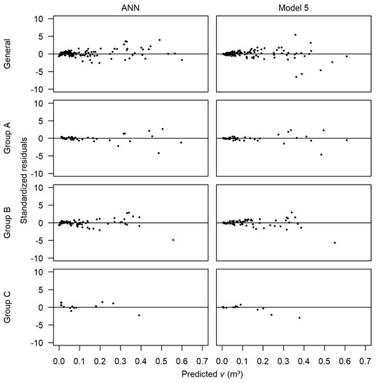 The volume predictions of Model 5 and the best ANN selected for the general data and for each clone group showed a high correlation between real volumes, with ryŷ ≥ 0.9940 (Table 5). The ANN was modeled more efficiently in the approach with the general data, with an RMSE smaller than 8%. The error variations of Model 5 in clone groups A and B were smaller than those of ANN. The accuracy in the v predictions of upper classes was lower in both methods (Figure 6).