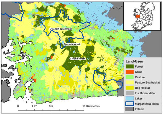 The Barony of Moycullen Case Study Area (CSA) in County Galway, Ireland, delineated by its land-uses. Pasture Bog Habitat is bog utilised for commonage pastures. Margaritifera areas refer to catchments with freshwater pearl mussels. The Cloosh Forest is the forest area at the centre of the CSA, Derrada is located north of Cloosh. The Owenriff catchment contains much of the Derrada forest and it is located just north of Cloosh.