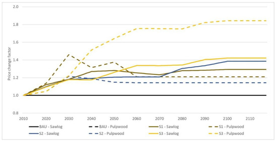 The CC scenarios also involve dynamic assortment prices for pulpwood and sawlog that reflect changing demands for wood fibre associated with the different levels of CC mitigation in the three scenarios. Wood assortment prices increase due to higher demand and the usage of wood fibre to reduce the impact of CC. The DP were produced by IIASA, using GLOBIOM, and they were based on external projections of wood demand in Ireland. The wood demand barely increased for S1 but the increases for S2 and S3 were in line with national projections of future wood harvest [57]. The national wood harvest increases rely on continued afforestation and the maturing of recently afforested private forests; however, there has been very little afforestation in the CSA recently and most of the non-forested sites are not eligible for afforestation. Thus, achieving these increases in harvested wood volumes was not explicitly used as a constraint in the Woodstock model. The prices were delivered as decennial values for the period 2010 to 2100. The delivered DP differed from those that were outlined by Teagasc [58], so a change factor was calculated and then interpolated linearly between the decennial values (Figure 3). The change factor was then multiplied with the standing volume value for the respective year to implement dynamic assortment prices in the Woodstock model (Table A6). The BAU scenario was run without DP. Generally, both the sawlog and pulpwood prices increased over the planning horizon. The Sawlog prices in S1 increased in the first 30 years and then plateau for the remainder of the planning horizon. Sawlog prices were the highest in S3, and they had a steep price increase towards the end of the planning horizon in S2 and S3. Pulpwood prices increased dramatically by 2030 in all scenarios, and from 2030 to 2060, the S1 and S2 pulpwood prices decreased and then remained static. The S3 pulpwood prices increased each decade throughout the planning horizon.