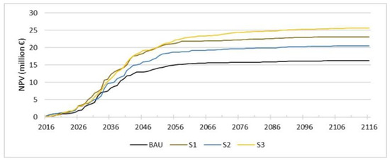 NPV development over time in the 100-year planning horizon for the BAU and three global scenarios.