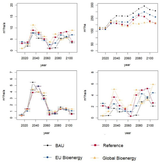 Annual harvested volume per hectare (top-left), standing volume (top-right), harvested sawlog volume (bottom-left) and harvested pulpwood volume (bottom-right) for the BAU and three global scenarios over the 100-year planning horizon. To show the trends, 10-year average values rather than actual annual volumes are presented. All values are in m3 ha−1 year−1.