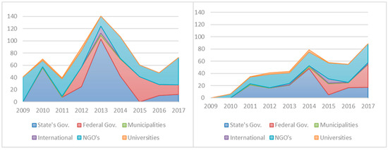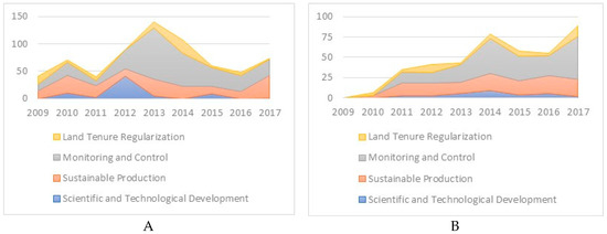 The findings of our analysis of the recipient projects in the Brazilian Amazon Fund reflect a broad variety of stakeholders and activities. Following the categorization of Luttrell, Loft, Fernanda Gebara, Kweka, Brockhaus, Angelsen, and Sunderlin [27], the recipient projects of the financial resources from the Amazon Fund often involve the largely indirect contributions of effective facilitators, legal rights holders, cost-incurring groups, forest stewards, or poor communities. Moreover, the Amazon Fund’s financial resources were channeled towards the direct and structural drivers of deforestation, but this distribution was not proportional to the importance of addressing these drivers, as argued by some scholars (e.g., [32]). Investment patterns tend to reflect specific relations between specific stakeholder groups and project activities. Although activities also vary considerably, there are some general patterns. Federal government organizations tend to invest in development of monitoring systems (45.7%) and inventory data (22.6%), which reflects a main concern with gaining control over deforestation dynamics. State government organizations tend to invest mostly in CAR implementation (40.1%) and capacity-building for state and municipal organizations (20.3%), thereby incurring many of the costs of federal policies. Finally, investments by NGOs have mainly benefited local communities who aim to adopt sustainable production activities (64.2%), but NGOs have also supported (more than federal or state government organizations) land tenure regularization projects (19.3%).
