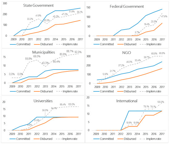 However, the ability of different stakeholders to approve projects with the Amazon Fund did not match their implementation capabilities. In the last decade, only USD 405.3 of 667.3 million (i.e., 60.7%) has been transferred to project owners. Average annual disbursements to state governments have hovered between USD 16 and 21 million in most years, with a sudden peak of USD 47.6 million in 2014 and then a sharp drop to USD 4.8 million in 2015. Disbursements to federal government increased exponentially from a small base of only USD 2.4 million even in 2014 to USD 37.7 million in 2017. Finally, disbursements to NGOs steadily increased from USD 6.4 million in 2010 to USD 30.7 million in 2017. From these three groups of beneficiaries, the Federal Government has been demonstrated the largest implementation gap, starting with a very low implementation rate and reaching the execution of only 47% of the committed values by 2017. This was followed by the State Governments, whose spending rates stayed below 50%. Municipalities, Universities, and NGOs, in contrast, presented a better implementation capacity, being able to invest most of the resources obtained from the Fund.