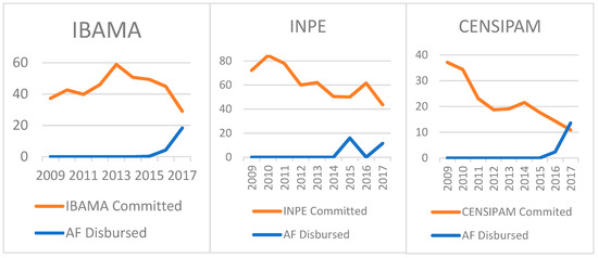 Comparison of Federal Committed Budgets with the Amazon Fund disbursements for INPE, IBAMA and CENSIPAM (used average 2009–2017 exchange rate: 2.434). Committed amounts represent the Portuguese term, ‘Empenhado’, an act that guarantees that there is an amount necessary to pay for an assumed commitment and creates a payment obligation for the government.