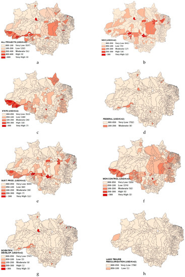 Spatially, Amazon Fund allocations display a large concentration (Figure 5a) in 64 municipalities along the (Figure 5a) region stretching from the southeast of Pará towards the western regions in the Mato Grosso, Rondônia and Acre states, municipalities that contain, since 2000, the highest consolidated deforestation rates in Brazil. NGO and state projects explain much of this concentration (Figure 5b,c), whereas federal projects had no significant contribution, mainly due to their nationwide focus (Figure 5c,d). Federal government projects are the most evenly distributed across the landscape, averaging below 26 USD/ha, which could be due to the all-encompassing nature of the geographic information systems (GIS—Geographic Information Systems) and remote sensing activities that these projects tend to promote. At the same time, disbursements to larger federal agencies, such as EMBRAPA, tend to concentrate in eight cities in the Legal Amazon, including Rio Branco, Manaus, Boa Vista and Macapá, where these agencies are located (Figure 5d). Finally, while municipalities benefit indirectly from various types of support, direct support only went to 6 of the 772 municipalities in the Legal Amazon and amounted to only USD 7.8 million. Most of these resources (65.2%) went to the municipal government of Alta Floresta, in northern Mato Grosso. In addition, the Amazon Fund had also financed research of the state universities of Pará (in Belem) and Amazonas (in Manaus) as well as to the development of satellite-based monitoring systems by INPE in Manaus (Figure 5g).