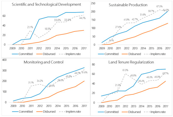 Although slightly slower than noted above, actual disbursements to individual projects have corresponded to commitments, with most disbursements going to monitoring and control (49.6%) and sustainable production (31.9%). Monitoring and Control was responsible for most of the variation (see right graph of Figure 6), peaking in 2014 (USD 43.1 million) and 2017 (USD 53.5 million). Notably, disbursements for scientific and technological development have never gotten much traction, slightly peaking only in 2013 and 2014, and also presents the lowest implementation rate up to 2017 (Figure 7).