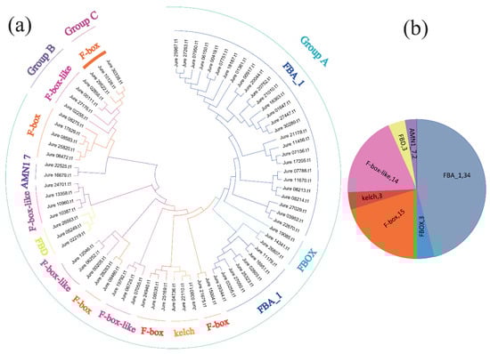 To identify the F-box genes from common walnut, an HMMER (biosequence analysis using profile hidden Markov models) search was performed against a local genome database using the seed files for the F-box (PF00646), F-box-like (PF12937), F-box-like 2 (PF13013), FBA (PF04300), FBA_1 (PF07734), FBA_2 (PF07735), FBA_3 (PF08268), and FBD (PF08387) domains. We acquired 111 candidate F-box genes from the common walnut whole genome. Those 111 candidate protein sequences were submitted to the SMART online software and Pfam online software to check the presence of the F-box domain. In total, in this study, 74 F-box genes were detected in common walnut (Table S2, Supplementary Materials). Based on the similar domain in which common walnut F-box genes were identified, the F-box genes were classified into eight subfamilies (Figure 1a). The most abundant F-box genes (34, 45.9%) were those with a similar known functional domain FBA_1, classified as the FBA_1 subfamily. The other 40 genes displayed the presence of one or more known functional domains and were classified as F-box subfamily (15, 20.3%) which contained the F-box domain, the F-box-like subfamily (14, 19.1%) which had F-box-like repeats, the FBD subfamily (3, 4.2%) which contained FBD domains, the FBOX subfamily (3, 4.2%) which had FBOX domains, the Kelch subfamily (3, 4.2%) which contained Kelch domains, and the Amn1 subfamily (2, 2.2%) which had AMN1 (Antagonist of mitotic exit network protein 1) domains (Figure 1b).