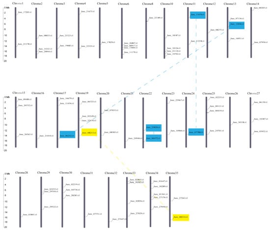 We found a total of five gene pairs of F-box gene family members (Jure_21010.t1 and Jure_20752.t1; Jure_08213.t1 and Jure_08214.t1; Jure_20752.t1 and Jure_21010.t1; Jure_27447.t1 and Jure_30289.t1; Jure_30289.t1 and Jure_27447.t1) (Table S3, Supplementary Materials). Interestingly, the Ka/Ks ratios of these five F-box sister pairs were less than 1, and divergence was estimated to be 100 Mya (Table S3, Figure S1, Supplementary Materials). The maximum number of F-box genes detected on pseudo-chromosome 34 (6) (Figure 2; Table S4, Supplementary Materials). The results showed that F-box genes were randomly distributed on the pseudo-chromosomes of common walnut. In all 74 F-box genes, one gene pair of F-box gene family members (Jure_08214.t1 and Jure_08213.t1) exhibited tandem duplication and three gene pairs (Jure_06252.t1 and Jure_12046.t1; Jure_25820.t1 and Jure_06472.t1; Jure_11670.t1 and Jure_07788.t1) exhibited segmental duplication (Figure 2).