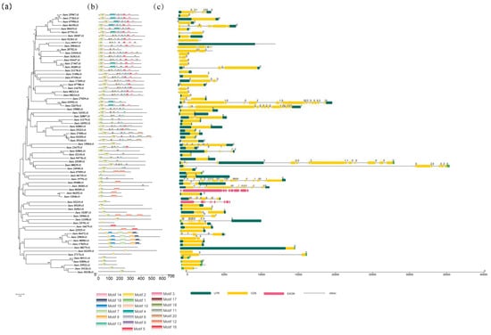 (a) Phylogenetic relationships, (b) motif compositions, and (c) gene structures of the 74 F-box genes identified in common walnut. (a) Phylogenetic relationships used the NJ method, and different colors represent different groups. (b) Colored boxes indicate conserved motifs, and gray lines represent non-conserved sequences. The length of motifs in each protein is shown proportionally. (c) UTR represents upstream, CDS represents coding sequence, and EXON represents exon; 0, 1, and 2 represent different types of phase. Phase 0: located between two consecutive codons; Phase 1: splitting codon between the first and second nucleotides; Phase 2: between the second and third nucleotides of a codon.