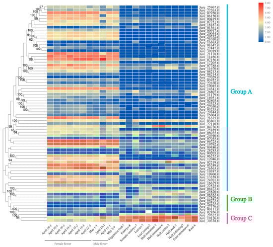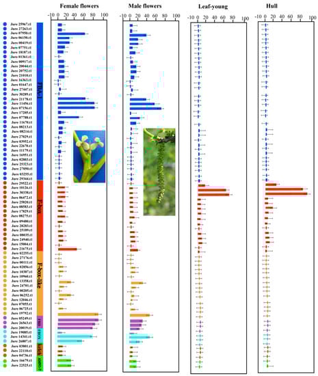 To further reveal the expression patterns of F-box family genes in common walnut, public transcript data, transcript sequencing data, and digital expression profiles were investigated in common walnut tissues including male and female flowers (Figure 4; Table S5, Supplementary Materials). For female and male flowers, we collected nine periods of female flowers and three periods of male flowers; the period from April to May was a key period of flower development for the flowering of common walnut, so we collected these tissues. Of course, we could notice that the members of the walnut F-box gene family were not much different within the period. The difference was that there was no obvious increase in the expression level with the developmental period. Based on phylogenetic analysis and expression level, we found a clear pattern that Group A had a higher expression in female and male flowers than other tissues; the genes which were classified into Group B were both lowly expressed in all tissues of common walnut; in addition, for the genes classified into Group C, the F-box gene family members (Jure_29522.t1, Jure_10126.t1, and Jure_30338.t1) were highly expressed in other tissues, including those of vegetative bud, embryo, somatic embryo, leaves, young leaf, immature hull, hull cortex, hull peel, hull dehiscing, and root (Figure 4). For the F-box gene family, we were most interested in those which played an important role during common walnut male and female flower development and ripening (Figure 4). Expression profile analysis showed that some F-box genes had a higher expression in multiple tissues. For instance, Jure_07950.t1, Jure_20044.t1, Jure_07156.t1, Jure_11456.t1, Jure_06725.t1, Jure_21675.t1, and Jure_26807.t1 were highly expressed in male and female flowers, especially Jure_05249.t1 and Jure_02219.t1 which had a quite different expression in male and female flowers, Jure_05249.t1 which had a high expression in female flowers, and Jure_02219.t1 which had a low expression in male flowers, and we found that Jure_05249.t1 had a special domain which was FBOX and Jure_02219.t1 had a special domain which was F-box-like (Figure 4). During the female flower ripening, it was shown that some genes had an increased expression level with female growing, for example, Jure_21178.t1, Jure_11456.t1, Jure_07156.t1, Jure_07788.t1, Jure_14341.t1, Jure_21675.t1, Jure_06725.t1, Jure_19792.t1, Jure_05249.t1, Jure_26563.t1, Jure_13358.t1, and Jure_16679.t1. In male flowers, Jure_10126.t1, Jure_30338.t1, Jure_26563.t1, and Jure_07156.t1 had a higher expression level on 10 April than in the other two periods. Overall, in the reproductive tissues (male and female flowers) and vegetative tissues (vegetative bud, embryo, somatic embryo, leaves, young leaf, immature hull, hull cortex, hull peel, hull dehiscing, and root), a total of 13 members (Jure_07950.t1, Jure_21178.t1, Jure_07156.t1, Jure_07788.t1, Jure_14341.t1, Jure_21675.t1, Jure_06725.t1, Jure_19792.t1, Jure_06252.t1, Jure_02219.t1, Jure_05249.t1, Jure_26563.t1) of the F-box gene family were highly expressed in reproductive tissues, while those in other vegetative tissues were low in expression, and three F-box genes (Jure_29522.t1, Jure_10126.t1, Jure_30338.t1) were higher in reproductive tissues than in nutritive tissues (Figure 4).