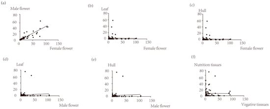 In order to compare the differences between the F-box gene expression level in reproductive tissues and vegetative tissues, we selected male and female flowers, young leaves, and hull with biological replicates to create a clear expression pattern, as shown in Figure 5. Transcript expression analysis of different tissues of common walnut (male flower, female flower, young leaf, and hull) showed that the F-box gene family expression level was high in female flowers, and male flowers had a similar pattern, while the expression level was low in leaf and hull (Figure 5). However, the linear relative regression of the F-box gene family of common walnut was different in male flowers, female flowers, leaf, and hull (Figure 6). The results revealed that the expression of F-box genes in male flowers was positively correlated with female flowers in common walnut (Figure 6a). However, there was no correlation of expression levels between leaf and female flowers, hull and female flowers, leaf and male flowers, hull and male flowers, and vegetative tissues and germinal tissues (Figure 6). There was no significant positive or negative correlation between the expression level of the F-box gene in leaves and the expression level in female flowers; this was also the case in hull and female flowers, leaves and male flowers, and hull and male flowers. We averaged the expression values of vegetative and reproductive tissues at various stages and performed regression analysis, which did not show an obvious positive or negative correlation.