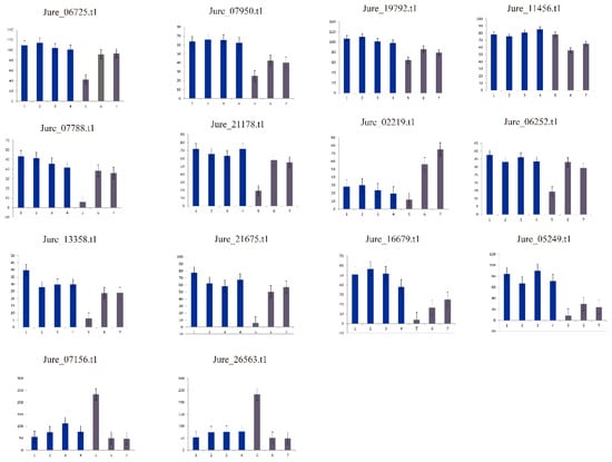 Expression of 14 F-box genes in various stages of female and male flowers. The X-axis represents female and male samples from different growth periods; 1, 2, 3, 4, 5, 6, and 7 represent 10 April, 15 April, 22 April, 1 May, 10 April, 11 April, and 2 May. The blue represents the expression level in female flowers, and the gray represents the expression level in male flowers. The Y-axis represents the relative expression level of F-box gene of common walnut. Error bars represent the standard deviations of three replicates. The expression level data are as shown in Table S5 (Supplementary Materials). We used two or three biological replicates from the same organization in the same period in Table S5 (Supplementary Materials).