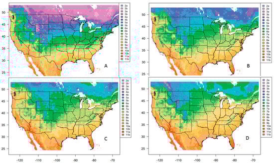 Current plant hardiness zones (panel A) and plant hardiness zones under GFDL-ESM2G RCP8.5 (panel B), CanESM2 RCP8.5 (panel C), and HadGEM2-ES RCP8.5 (panel D).
