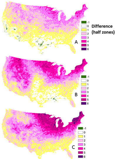 Plant survival is closely linked with absolute minimum temperature; hence, the coldest day instead of the hottest day is used to portray climate limitations for plants [19] (Table 1). Plant hardiness zones are a familiar tool and provide tangible connections between climate and appropriate species for the climate [20]. Plant hardiness zones shifted by approximately one (5.6 °C) to one and a half zones (8.4 °C; Figure 1 and Figure 2). Reduced cold hardening, late spring frost damage, and not meeting chilling requirements will potentially affect plant survival and production [20]. Furthermore, warmer extreme minimum temperatures allow expansion of plant pests and pathogens.