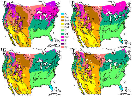 The following are available online at https://www.mdpi.com/1999-4907/10/3/280/s1, Table S1: Percent of total area for plant hardiness zones under current climate and GFDL-ESM2G RCP8.5, CanESM2 RCP8.5, and HadGEM2-ES RCP8.5 in the United States, Table S2: Percent of total area for Köppen-Trewartha climate types under current climate and GFDL-ESM2G RCP8.5, CanESM2 RCP8.5, and HadGEM2-ES RCP8.5 in the United States.