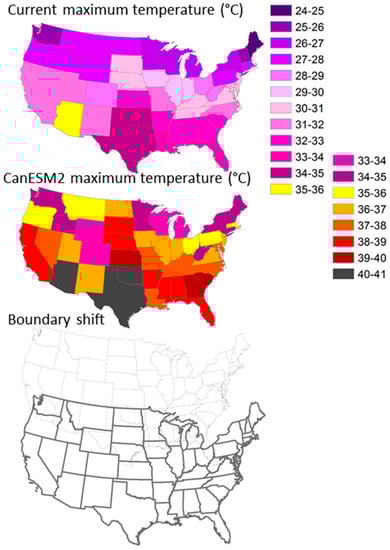 Temperature changes in the hottest months for states averaged 4.9 °C (range 3.5 to 6.7 °C), 6.8 °C (range 4.2 to 9.7 °C), and 8.6 °C (range 5.1 to 12.3 °C) for the GFDL-ESM2G, CanESM2, and HadGEM2-ES climates, respectively. Although state boundaries are stationary, the northernmost tier of states generally may develop the hottest months of the southernmost tier of states under future climates (Figure 4, current climate compared to CanESM2 climate, which expressed a moderate amount of change between GFDL-ESM2G and HadGEM2-ES). That is, Montana’s hottest month in the future became slightly hotter than Arizona’s current hottest month, Wisconsin and Michigan developed the hottest months of Florida and Louisiana, and the hottest months of other northernmost states became at least as hot as the hottest months of Texas and Oklahoma.