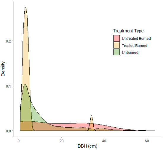 Kernel density estimates showing the distribution of diameter at breast height (DBH) for all trees ≥1.4 m in height recorded within untreated burned, treated burned, and unburned sites.