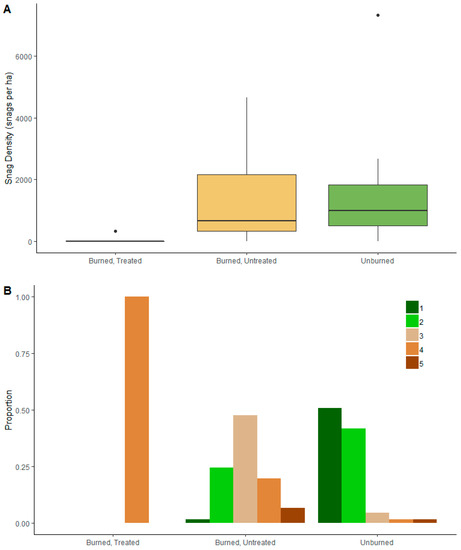 (A) Snag density in burned treated sites, burned untreated sites, and unburned sites; (B) The proportion of snags that fell within each decay class (1–5) in burned treated, burned untreated, and unburned ponderosa pine forest, where a value of 1 represents a low level of decay, and a value of 5 represents a high level of decay.