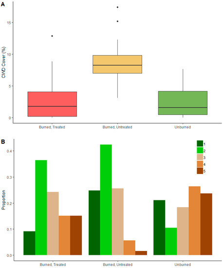 (A) Percent coarse woody debris cover (CWD) in burned treated sites, burned untreated sites, and unburned sites; (B) The proportion of CWD that fell within each decay class (1–5) in burned untreated, burned treated, and unburned ponderosa pine forest, where a value of 1 represents a low level of decay, and a value of 5 represents a high level of decay.