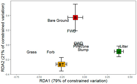 Treated burned areas were more strongly associated with grasses and forbs, while untreated burned sites were more strongly associated with fine woody debris and bare ground cover (Figure 4; Table 1 and Table 2). That said, there was no significant difference in overall understory cover composition between treated compared to untreated burned sites (F = 2.16, p = 0.11). Unburned forest sites were strongly associated with high levels of litter (Figure 4) and differed significantly from both treated and untreated burned sites (F = 11.29, p ≤ 0.01; F = 6.09, p ≤ 0.01 respectively).