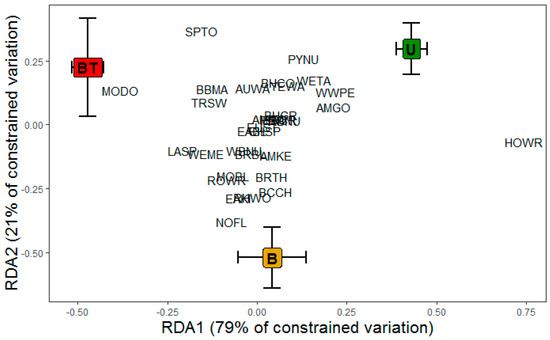 Mean constrained site scores for the first two axes of a redundancy analysis for avian community composition across treated burned (BT), untreated burned (B), and unburned (U) ponderosa pine forest. Bars indicate 95% confidence limits of the mean site scores.