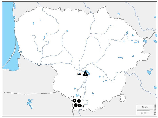 Map of Lithuania showing the study site: potentially resistant to root rot Scots pine clones seed orchard (SO—54°53′0.37″ N; 24°4′20.45″ E) and H. annosum strains isolating points (3 strain —53°58′14.94″ N; 23°42′32.92″ E, 4 strain—53°59′33.69″ N; 23°39′56.22″ E, 8 strain—53°58′11.77″ N; 23°37′3.47″ E, 14 strain—54°10′20.02″ N; 23°39′57.38″ E).
