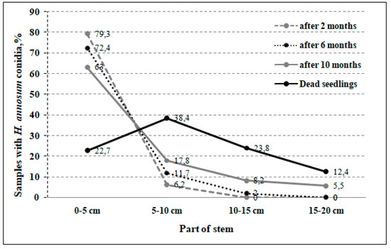 Seedling vitality and incidence rate of H. annosum (fungal growth) infection were examined at three time periods over the course of 2018: at two months after inoculation (i.e., inspection I), at the beginning of vegetation six months after inoculation (inspection II), and at the end of vegetation (inspection III), ten months after inoculation. For each inspection period, three visually healthy and all dead seedlings were taken from each variant (more than 180 seedlings in total). For each of these samples, a 20 cm length of stem was cut into 5 cm pieces, split in half, and placed in separate sealed bags. After three weeks incubation at room temperature, the samples were checked for mycelia, conidiophores, and conidia formation characteristic of H. annosum [58].