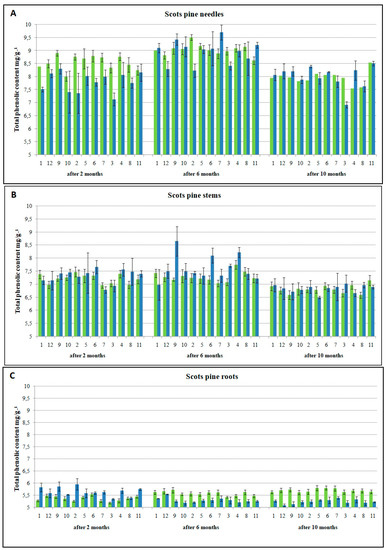 The Folin–Ciocalteu method has been widely used to determine the total concentration of phenols (TPC) occurring in plants [59]. Analysis of variance showed that the significant difference in TPC variation was observed in needles six months after inoculation (during the vegetation period), while in stems and roots this occurred two months after inoculation (during the dormancy period). The half-sib families (No. 2 and 9) with the lowest pathogen spread increased the accumulation of TPC in the roots two month after inoculation. Ganthaler and Mayr [66] revealed the seasonal variation and infection-induced changes in the accumulation of phenolic compounds. A study of Norway spruce resistant to Chrysomyxa rhododendri indicated that constitutive and early stage infection-induced concentrations of some phenolics strongly correlated with susceptibility and also reflected the levels of the tree’s resistance [67]. Some authors noted that phenolic secondary compounds may limit the growth of rust fungi in Norway spruce and Melampsora in willow [68,69] immediately after infection and prevent the development of infection symptoms. Our results have shown that a greater reaction in the accumulation of TPC in inoculated Scots pine seedlings occurs six months after inoculation.