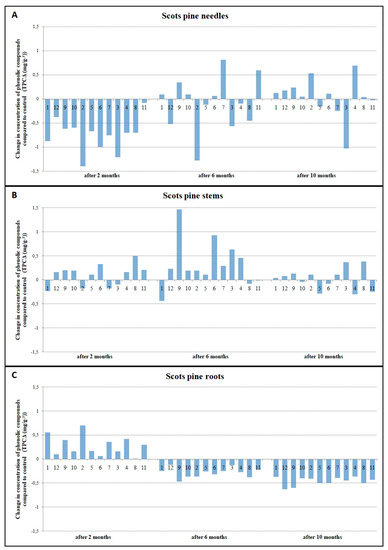 Samples of the seedlings’ roots, stems, and needles were collected from three biological replicates from both inoculated and control groups during the three time periods described above (Total samples number: 12 Scots pine half-sib families x 4 different H. annosum strains and 1 control x 3 biological replicates x 3 different seedlings’ parts = 540 samples during one time period). The 500 mg of fresh needles, stem wood, and root samples were stored at −20 °C until bioactive substances were analyzed. Before analysis, the samples were homogenized by A 11 basic Analytical mill (Laboratory Equipment, Staufen, Germany). The homogenized material was shaken with 10 mL of 75% methanol for 24 h at room temperature using a Kuhner Shaker X electronic shaker (Adolf Kühner AG, Birsfelden, Switzerland). The extracts were filtered through Whatman no. 1 filter paper.