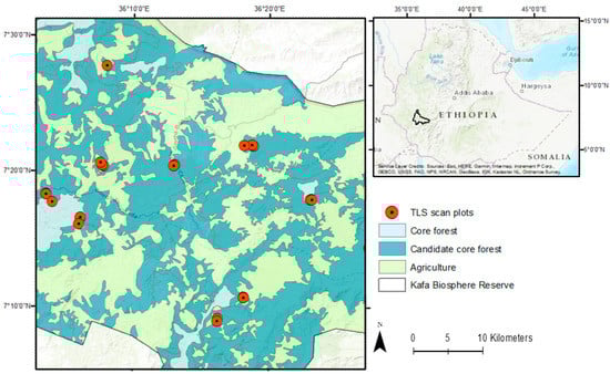 The field data on forest structure were collected in November 2015 in Kafa biosphere reserve, Ethiopia, consisting of 25 plots across four forest management types (Intact: 7 plots, coffee forest: 8 plots, silvopasture: 7 plots, and plantation: 3 plots). The details on the collection and analysis of the TLS and conventional forest measurements can be found in Decuyper et al. []. In short, a stratified sampling design was made based on various GIS data layers (i.e., fragmentation map, land use/cover map, and biodiversity assessment plots) of the study area to select field plots for measurements. The chosen plot locations were representative of their surrounding forest type. TLS measurements were made with a RIEGL VZ-400 terrestrial laser scanner (RIEGL Laser Measurement Systems GmbH, Horn, Austria). From the 25 plots, 21 plots had a radius of 20 m, while 4 plots had a 10 m radius due to difficult terrain. Five scanning positions (i.e., one in the center and four in the cardinal directions) were used per each plot to acquire three-dimensional measurements.