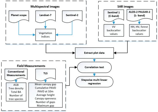 Data and methodological steps followed in estimating field-measured forest structure parameters using satellite remote sensing data. PAVD = plant area volume density, AGB = above ground biomass, BA = basal area.