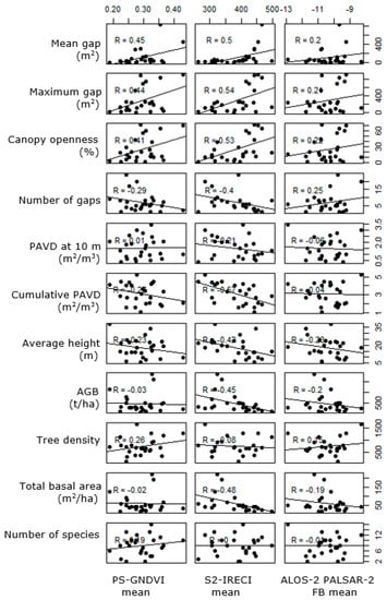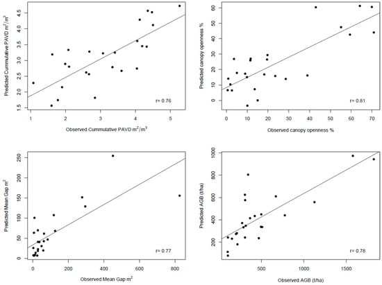 Overall, the canopy gap-related forest structure parameters (e.g., mean gap, maximum gap, canopy openness) were better correlated to SRS variables than the vegetation volume-related parameters (e.g., AGB, PAVD at 10 m). Other studies support this finding [,,] as SRS signals are weakened by canopy closure in tropical forests, thus providing limited information on volume-related parameters such as AGB and PAVD. In addition, studies have also shown that the relationship between forest structure and SRS derivatives might not always be linear [,,]. These algorithms have different assumptions on the distribution of the data, which have an effect on the models chosen for modeling the relationships, thus an implication on the upscaling or extrapolation of structural estimations [,]. The use of parametric methods, such as the linear regression model used in this study, are arguably suitable for a small dataset, whereas non-parametric methods, such as random forest, would be an appropriate choice for larger datasets where non-linear relationships could be reliably picked up [].