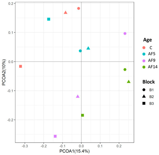 Principal coordinate analysis (PCoA) plot showing patterns of β-diversity in bacterial communities (OTU, operational taxonomic units level) of different agroforestry ages. C = crop monoculture; AF5 = 5-year-old walnut-based agroforestry; AF9 = 9-year-old walnut-based agroforestry; AF14 = 14-year-old walnut-based agroforestry.