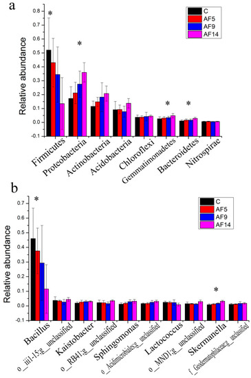 The relative abundance of bacterial phyla (a) and genera (b) of different agroforestry ages. C = crop monoculture; AF5 = 5-year-old walnut-based agroforestry; AF9 = 9-year-old walnut-based agroforestry; AF14 = 14-year-old walnut-based agroforestry. Asterisks indicate that the effect of agroforestry age is significant through ANOVA at p = 0.05.