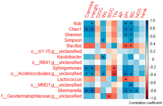 Relation of tree and soil physicochemical properties with bacterial alpha diversity and abundant genera. Canopy, average tree canopy diameter in a plot; Height, average tree canopy diameter in a plot; DOC, dissolved organic carbon; Wc, water content; SOC, soil organic carbon; TN, total nitrogen; AP, available phosphorus; BD, soil bulk density; NO3, nitrate nitrogen; NH4, ammonium nitrogen; Nob, observed species number. Asterisks indicate significant correlation at p < 0.05.