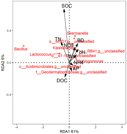 In RDA, the selected soil physicochemical properties explained 90.80% (adjusted R2 = 0.494) of the total variation of bacterial communities at the genus level, and the first two axes explained 67% of the variation (Figure 4). SOC (p = 0.015) and pH (p = 0.050) were revealed to be factors significantly affecting the bacterial community through the permutation test (Table S1).