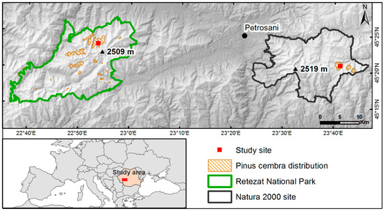 In the harsh climate of the treeline ecotone, forest dynamics and structure have been strongly altered by human land use [25]. The treeline ecotone is a transition zone between the closed forest and the upper limit of the isolated individuals [26,27]. The treeline ecotone range (Table S1) varies mainly due to thermal limitations, anthropogenic influences, and mechanical causes [26]. In the Romanian Carpathians, P. cembra occurs always inside protected areas [19] and may fall sometimes under areas with different status of protection. Protected areas contribute to habitat maintenance by controlling deforestation and pastoralism [28,29]. Human pressure varies significantly with protection status [29]. Between 1880 and 2000 deforestation close to the treeline ecotone was more intense in the Carpathians compared to the Swiss Alps [30,31]. In recent years human influence has decreased in both areas [25,32]. In Romania, the coverage of protected areas increased from 4.1% in 1989 to 24% in 2017 of the total country area [22]. In addition to the well-known IUCN protected area categories, the Natura 2000 network was created at the European Union level. Its aim is to facilitate the protection of threatened species and natural habitats not through strict protection but rather through a sustainable approach to promote traditional practices [22]. Unlike national parks (IUCN category II), the lack of funding for the European Natura 2000 network leads to social and economic tensions rather than actual conservation and development [22]. National parks often have core zones with more restrictive management than the Natura 2000 network. To capture also possible differences induced by the protection status, two populations of P. cembra were sampled in two areas: a Natura 2000 site, established in 2007, which does not benefit from strict protection; and a National Park (IUCN category II), which has been under protection since 1935. The Natura 2000 site was influenced by past anthropogenic disturbances and presents a higher grazing intensity than the Retezat National Park [33]. So far, P. cembra populations were mainly analyzed by dendrochronology, to reconstruct the past climate [34,35]. In addition, responses to present and future climate change were assessed [14]. Although the spatial structure has been analyzed in the Alps [25,36], little is known about the spatial distribution of individuals and spatial patterns of the tree sizes in the Carpathian Mountains.