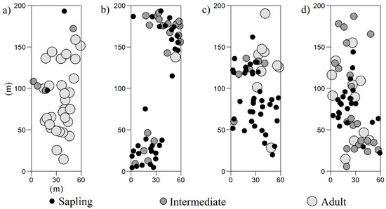 Spatial distribution of Pinus cembra L. within the plots from the Retezat National Park (a,b); and from the Natura 2000 site (c,d). The quantitative marks indicate the tree sizes: sapling (10–130 cm height), intermediate (1–15 cm diameter breast height), adult (>15 cm diameter breast height).