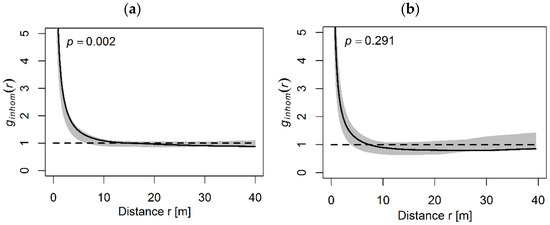 The inhomogeneous g(r) with the heterogeneous Poisson null model (HP) was applied to account for second-order effect [41]. Large-scale aggregation is attributed to environmental heterogeneity (soil, nutrients, elevation, slope) and small-scale clustering (<20 m) is attributed to plant–plant interactions [42]. Values above the totally random distribution curve (HP—the 95% confidence interval) indicates a clumped distribution, within the HP indicates a random distribution and below the HP a regular distribution. The univariate inhomogeneous pair-correlation function ginhom(r) was used with 1000 Monte Carlo simulations and 95% confidence interval to analyze and compare the distribution patterns (regular, clustered or random) of tree individuals. The bandwidth was determined for each dataset by using the cross-validated bandwidth selection function [43]. The Epanechnikov kernel and Ripley’s isotropic edge correction were applied to the data [43]. The function g(r) accounts for point density at a specific distance, while the related inhomogeneous K(r) is a cumulative distribution function that calculates the average number of points in a given radius r [41]. From an ecological point of view, K(r) makes the interpretation of the results more difficult but has the advantage of better testing of the goodness-of-fit [44]. Therefore, we used both inhomogeneous g(r) for detecting fine-scale patterns and K(r) for the confirmation of the null model.