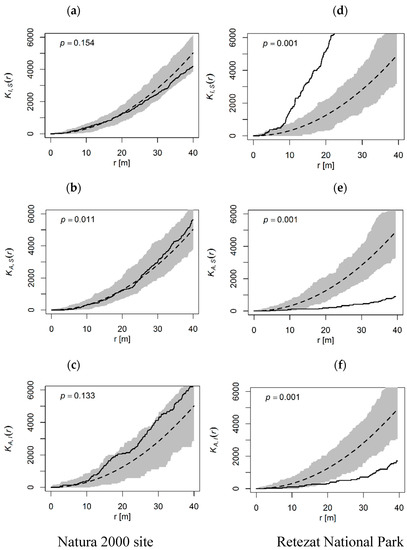 Analysis of bivariate pattern revealed the interaction structure between two types of points (e.g., sapling vs. adult). If the points had extra information attached to them (called quantitative marks: the attribute of the point, such as tree height or diameter) then a bivariate analysis can be carried out [37,39]. Bivariate cross-k multitype analysis (Kij(r)) can be defined by analogy to Ripley’s K-function: