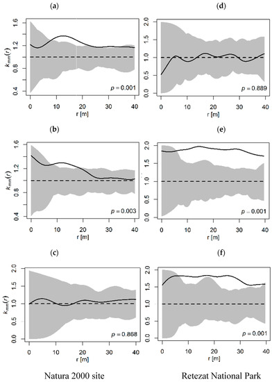 - Loosmore, N.B.; Ford, E.D. Statistical inference using the G or K point pattern spatial statistics. Ecology 2006, 87, 1925–1931. [Google Scholar] [CrossRef]