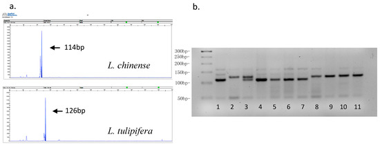 PCR products amplified by expressed sequence tag-simple sequence repeat (EST-SSR) marker (ESSR119) by two methods. (a) Peakscanner analysis showed one main peak located at 114 bp in one of the L. chinense individuals and one main peak located at 126 bp in one of the L. tulipifera individuals. (b) Representative gel showing amplification profiles of ESSR119 marker and its fragment length polymorphism among four individuals of L. chinense and four individuals of L. tulipifera. The amplifications are resolved in 3% agarose gel along with 50 bp DNA size standard. Note: lane 1–3 are standard samples. 1, L. chinense (114 bp); 2, L. tulipifera (126 bp); 3, Hybrid Liriodendron (L. chinense (Lushan) X L. tulipifera (South Carolina)) (114 and 126bp); 4–7, four plants of L. chinense come from Sangzhi, Hunan Prov.; Youyang, Sichuan Prov.; Xuyong, Sichuan Prov.; Lushan, Jiangxi Prov., respectively. They all showed one main 114 bp band; 8–11, four individuals of L. tulipifera come from North Carolina, USA; Georgia, USA; South Carolina, USA; Missouri, USA, respectively. They all showed one main 126 bp band.