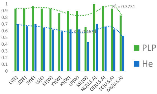 Genetic diversity and trendline of nine L. chinense provenances and four L. tulipifera provenances. The genetic diversity of the western China provenances was lowest compared to the others. E in the bracket represents the eastern China population and W indicates the Western China population. The conjunction curve is a sextuple polynomial. He: expected heterozygosity; PLP: the proportion of polymorphic loci at the 5% level.