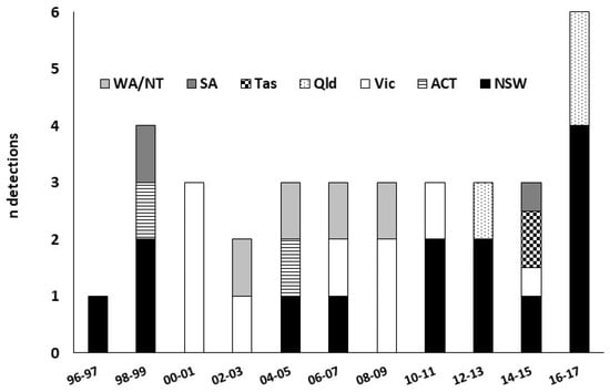 Since 2005, the implementation of the EPPRD has resulted in more structured and coordinated responses to exotic plant pest detections, including equitable cost-sharing between government and industry for the cost of eradication and response. However, recent reviews identified the need for a more coordinated approach to forest biosecurity in Australia [13,19] and highlighted the risks and costs of exotic forest pests to the Australian forest industry [17,30]. This led to the development of the National Forest Biosecurity Surveillance Strategy (NFBSS) [31] and appointment of a National Forest Biosecurity Coordinator [32]. A major goal of the NFBSS, “to reduce the risk of establishment of exotic forest pests”, provides a timely opportunity to investigate patterns associated with the establishment of recent exotic forest pests and pathogens in Australia. Our aims were three-fold: (1) To collate, analyse and summarise data on detection and response by government and industry to exotic forest pest incursions over the last two decades; (2) to review the success of eradication programs; and (3) to make recommendations to improve early detection of future incursions of exotic forest pests and thereby improve the likelihood of successful eradication.